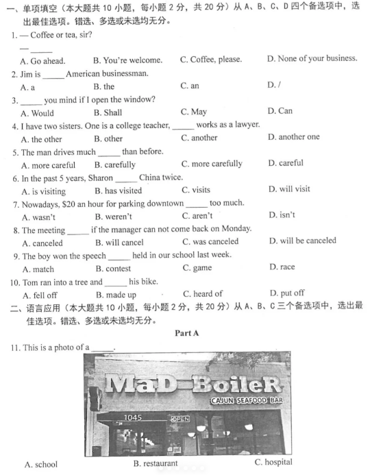 以上就是“湖南高职单招英语试卷”的全部内容,更多关于湖南高职单招的相关内容,如湖南高职单招报考条件、报名时间、考试科目、湖南高职单招招生成绩查询、分数线等敬请关注湖南高职单招网http://www.scdanzhao.com/