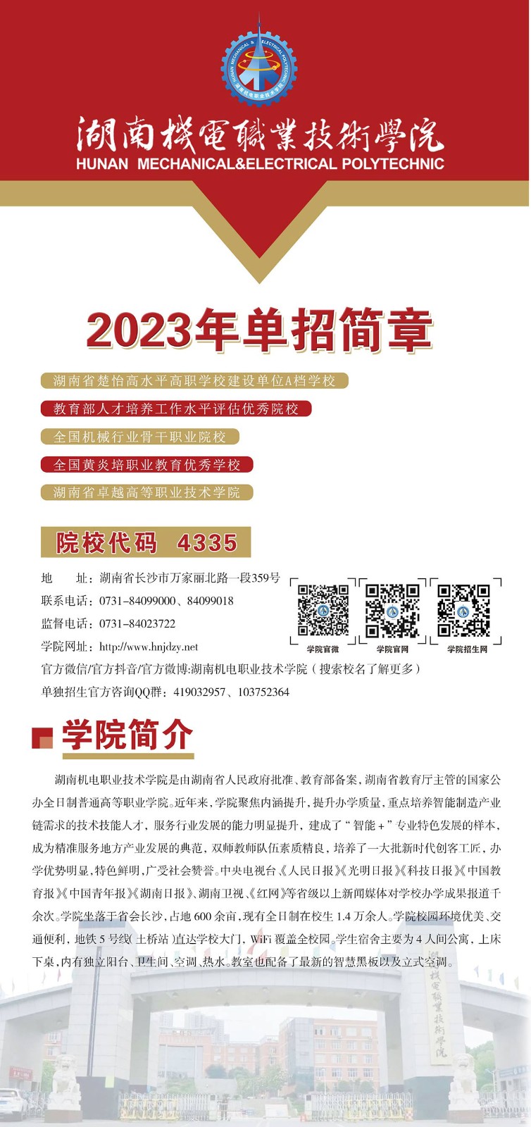 本文标签:湖南单招 招生简章 2023年湖南机电职业技术学院单独招生简章